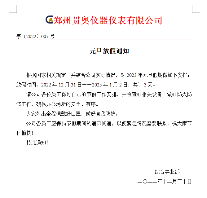 鄭州貫奧儀器儀表有限公司-2023元旦放假通知