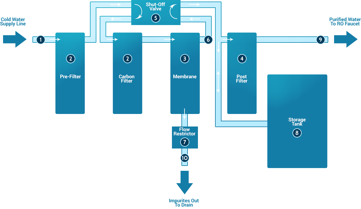 后過濾器:  水離開RO儲罐后,但在進入RO水龍頭之前,處理后的水經(jīng)過最終的“后過濾器”。后過濾器通常是碳過濾器。通過后過濾“拋光”過濾器,從產(chǎn)品水中除去任何剩余的味道或氣味。