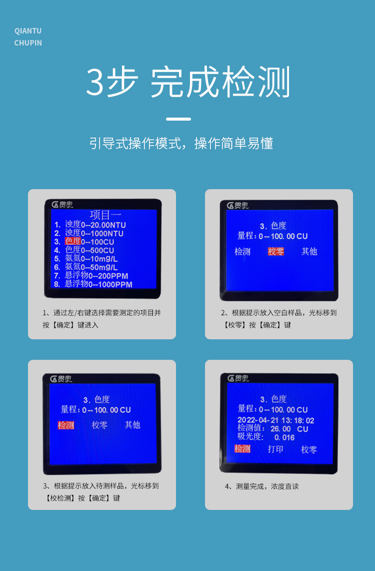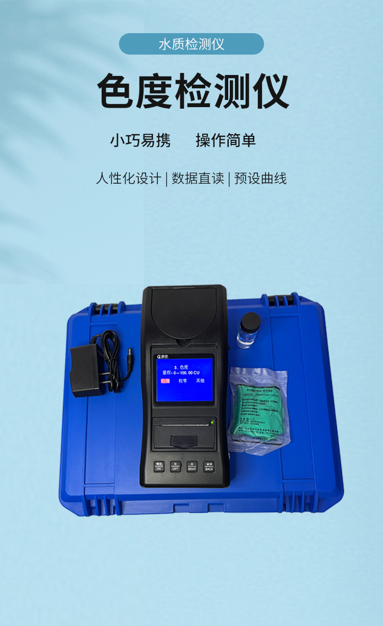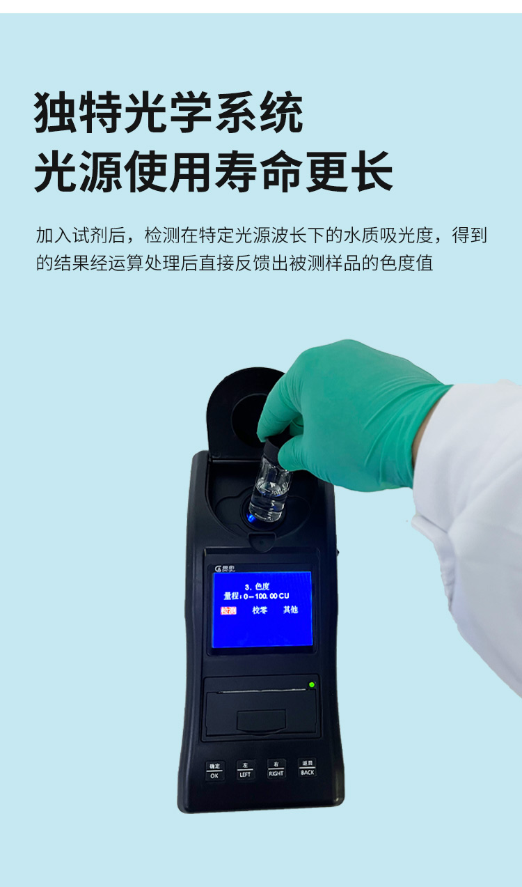 貫奧色度檢測儀可快速準確測定地表水、地下水、城市污水及工業廢水中色度指標,濃度直讀;可廣泛用于水廠、食品、化工、冶金、環保及制藥行業等部門。儀器是由單個的固定波長固定用途的分光光度計糅合而成的,采用分光光度法原理對各參數進行測量,在儀器中建立不同參數的濃度顯色程度與吸光度的線性曲線,儀器通過對顏色的辨別,得出被測水樣的濃度。本儀器采用全中文菜單,操作簡易易懂,使用方便快速測量準確度高。